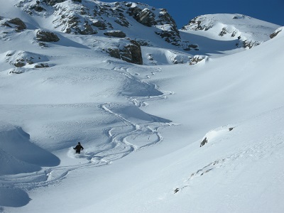 Il s’agit, en utilisant un matériel spécial –(fixations et « peaux de phoque »), de gravir un sommet ou un col pour bénéficier de la descente sur la neige souvent vierge.
